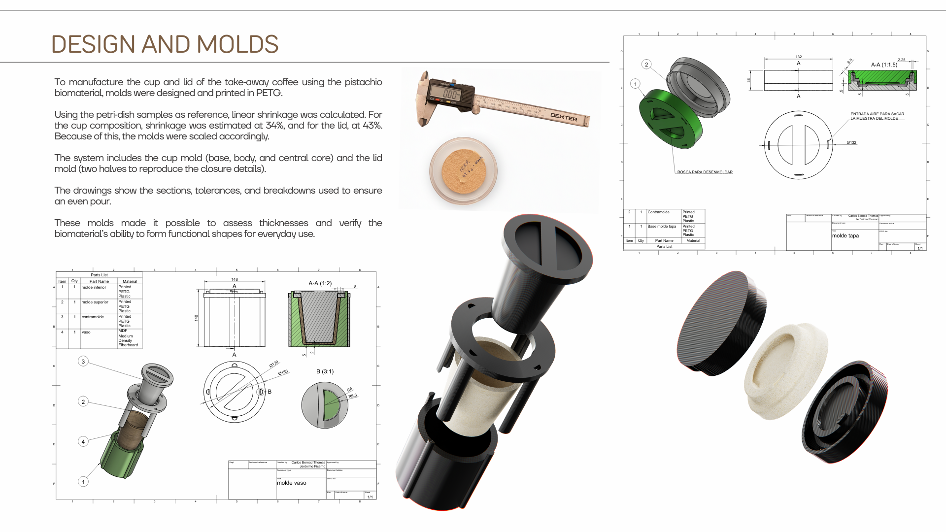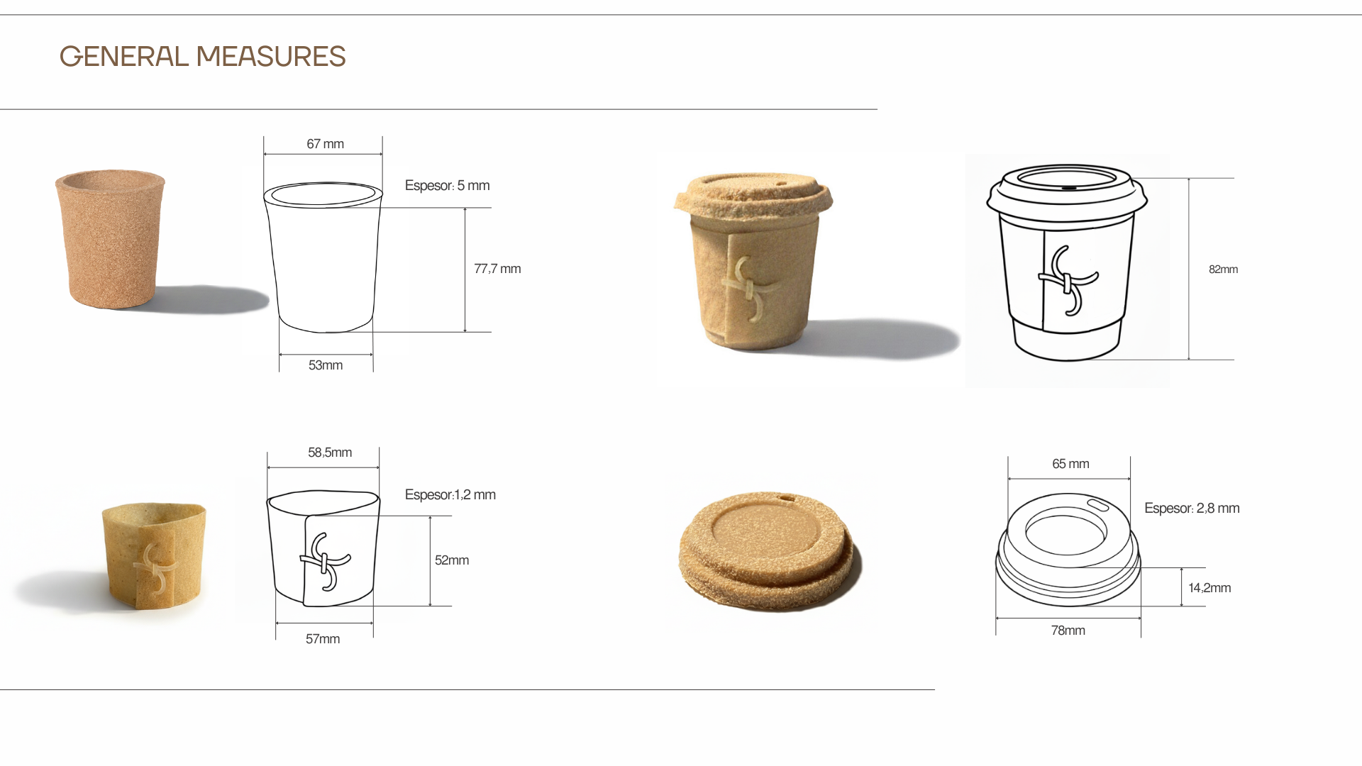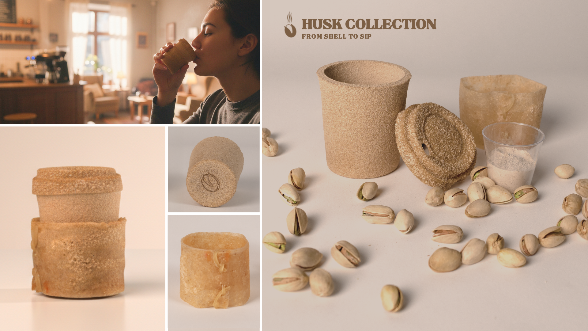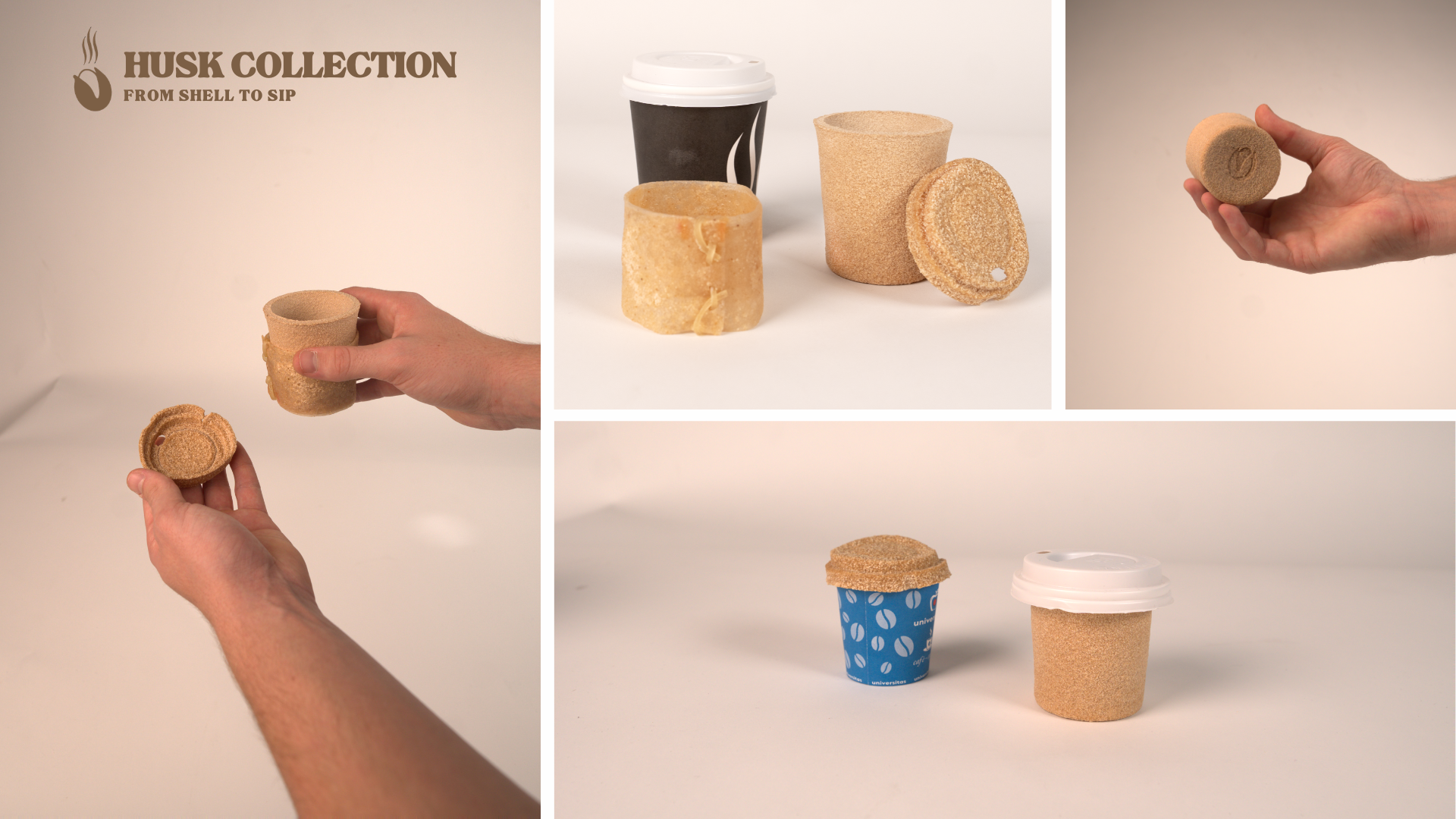 The material is applied to a family of takeaway coffee cup components — cup, lid and sleeve — offering a compostable alternative to conventional single-use packaging. The project connects waste valorization, circular design and material innovation, demonstrating how agricultural residues can become high-value sustainable products.